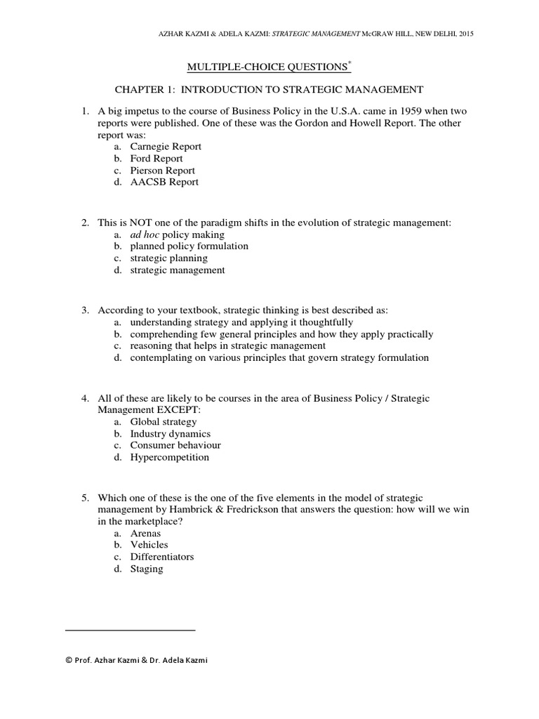 Strategic management is an on-going process that evaluates and controls the business and the industries in which the company is involved. Strategic Management MCQ Questions and answers with easy and logical explanations. One such example is the Model S which has been described above.